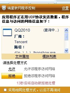 下载安装了2011测试版 刚安装完 查杀了一遍病毒 没有杀出来 可是杀软的监控都全部禁用了 没法开启 升级后问题就出现了 升级完后首先出现报错 然后电脑直接就反应不过来了 速度超慢 刚开始怀疑系统故障 重装了一遍系统(用的新萝卜家园10.4的ghost版系统) 可是故障依旧 后来重启将瑞星卸载 就可以了 速度立刻快了起来 还有 瑞星的防护我觉得应该改进一下吧 就像我登陆了一下QQ 刚提示允许或者禁止的选项 出了得有7、8次 我选上了 采用相同处理方式 可是还是一样提示 本人觉得玩电脑的大部分人还是对电脑的一些进程程序不是很明白的 如果运行一个软件出现这么多的提示 大家都可能不知道是什么东西 从而勿点了拒绝 造成无法访问 建议瑞星可以将常用的软件都默认允许 方便用户使用 还有感觉升级后查杀速度也很慢 查杀了C盘 查杀速度显示平均 3个/s 下面是我的部分截图 希望瑞星能尽快完善这么问题