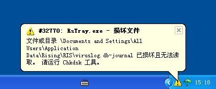 这张载图是2011版安装完毕。然后根据提示重启电脑,然后进入系统全盘扫描。发现3个木马病毒,我清理了2个,剩下一个,剩下的是e语言自带的,api的那个查询的工具。应该是误报,所以没处理。全部处理完毕,继续使用电脑,偶然打开一个程序,突然蓝屏死机。再开机自动扫描硬盘,进行硬盘检测....进入系统以后。提示。如图。