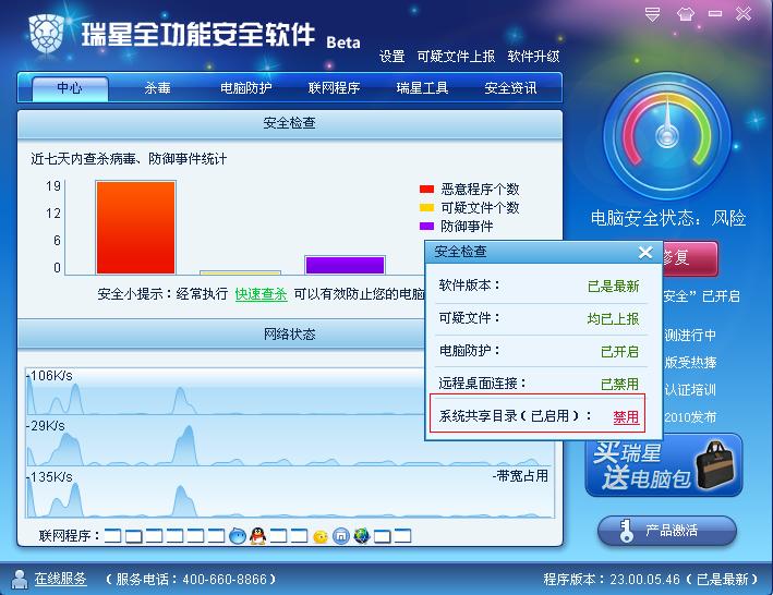 问题现象: 我将D盘的一个文件夹设为共享,瑞星的安全级别就报“高危”,并且显示“系统共享目录(已启用)”,提示“禁用”即可恢复安全级别。但问题是,局域网内为方便文件共享,设置文件夹为共享是很正常的事情,而且不是C盘的WINDOWS目录,应该不存在风险。建议瑞星改变安全策略。