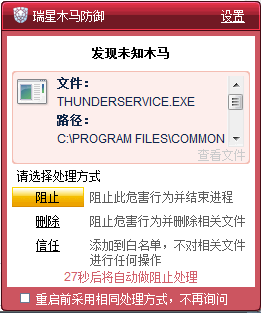 今天使用网页右键菜单调用迅雷下载时,瑞星木马防御弹出如下提示: