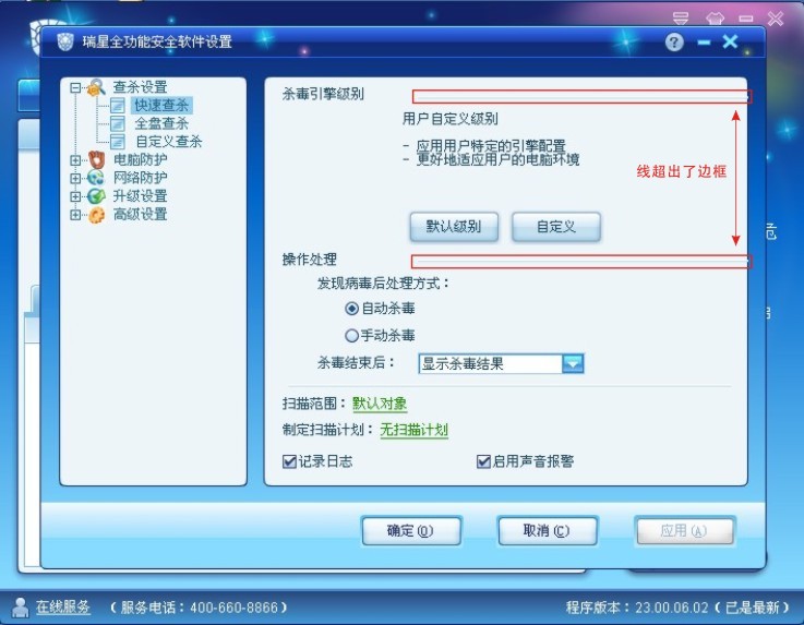 2、查杀设置里的--(快速查杀)、(全盘查杀)、(自定义查杀)三个选项的线都超出了边框,