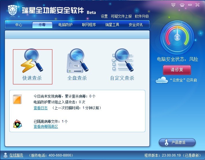 在点开RIS主界面,选择杀毒标签栏,再点击快速查杀,快速查杀就启动开始查杀了,与此同时,再点回中心标签栏,点一下小提示上的快速查杀连接,本来进行中的快速查杀又会重新开始。