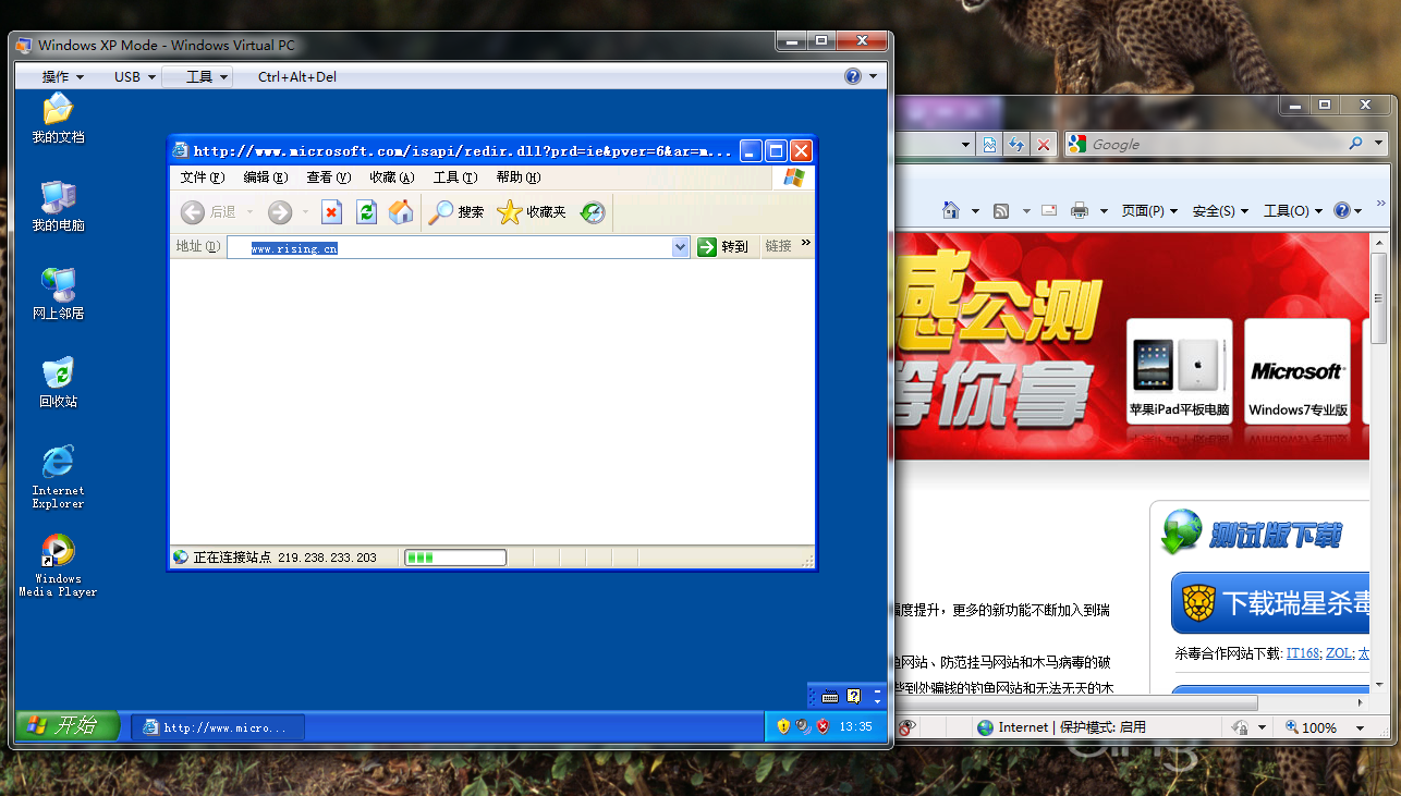 故障现象:只要开启瑞星默认的保护,就无法使用Windows XP Mode上网。系统防护日志里面也没有显示拒绝Windows Virutual PC连接网络的日志。打开网址时可以显示IP但不能打开页面。如图。