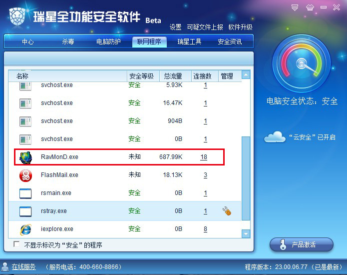 :在“联网程序”中瑞星的RavMonD.exe进程的安全等级还是“未知”,但在XP下已是“安全”