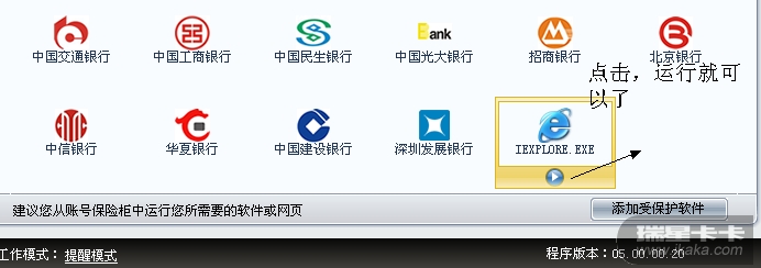打开瑞星账号保险柜,,,钩选开启我的网站保护,,,然后点击添加受保护软件,,,选择手动添加,,,弹出帐号保险柜,,点击浏览,,,选择你用的浏览器程序名称,,,比如:C:\Program Files\Internet Explorer\IEXPLORE.EXE,,,再把帐号类型从软件更改到网页,,,再把农业银行的网址添加到网页地址里就可以了,,,最后按确定。