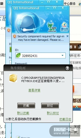 瑞星卡卡安全论坛个人产品讨论区瑞星其他产品账号保险柜5.0 拦截注入国际版QQ之后,国际版QQ再也打不开了