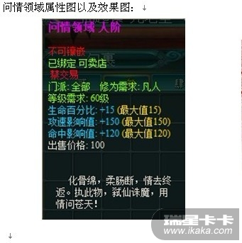 问情领域:包含一个固定属性(生命+15%)和两个不固定的满属性,两个不固定的满属性将随机从以下5个属性中获得:物理防御+15%、五行防御+15%、闪避值+120、命中值+120、攻速值+150。