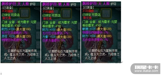 人阶鹊桥护符:分为天、地、人三种,其特色属性+120(满),另一属性+100(满),另附2个紫色1%随机属性