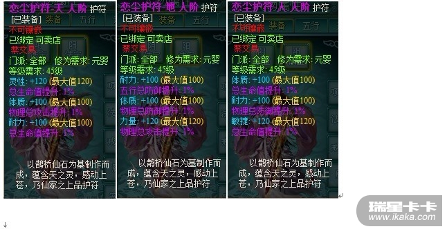 人阶恋尘护符:分为天、地、人三种,其中特色属性+120(满),其余两属性+100(满),另附3个紫色1%随机属性