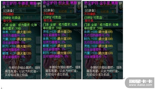 地阶恋尘护符:分为牛郎星、织女星、金牛星三种,其中特色属性+120(满),其余三属性+100(满),除2固定总生命值+1%紫属性外,另附2个紫色1%随机属性