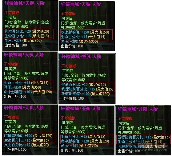“轩辕神域”包括七种,每种除生命15%满外,另有一条满属性与一条 属性。(以下图片第三条属性为 ,仅供参考)