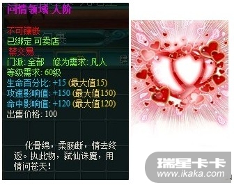 问情领域:包含一个固定属性(生命+15%)和两个不固定的满属性,两个不固定的满属性将随机从以下5个属性中获得:物理防御+15%、五行防御+15%、闪避值+120、命中值+120、攻速值+150。
