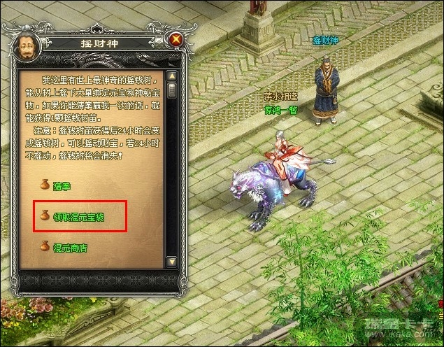 当玩家充值满500元宝时,便可与皇城摇财神(220,240)对话领取混元宝袋,使用混元宝袋可以随机获得混元金币、混元银币和混元铜币。有了这些混元货币,玩家就能够随意兑换混元商店内的宝贝了。平台用户参与此次充值赠送活动,还将有机会获得《剑灵·诀》合作伙伴风行、5173、迅游、快玩送出的额外免费赠礼。