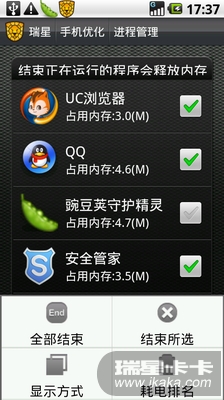 打开手机优化后,进入进程管理,看到正在运行的程序有:UC浏览器、QQ、豌豆夹、安全管家。
