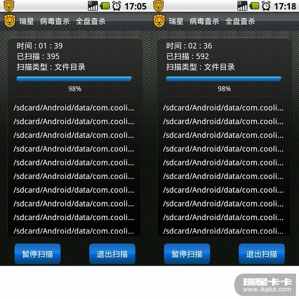 手机在全盘查杀病毒的时候进入待机后貌似会暂停,希望可以增加后台查杀,从截图可以看出来17:15分停留在98%,待机一段时间,17:18还是停留在98%,而查杀时间也是从01:39到02:36中间才经历了57秒的时间,可见后台没有进行工作。