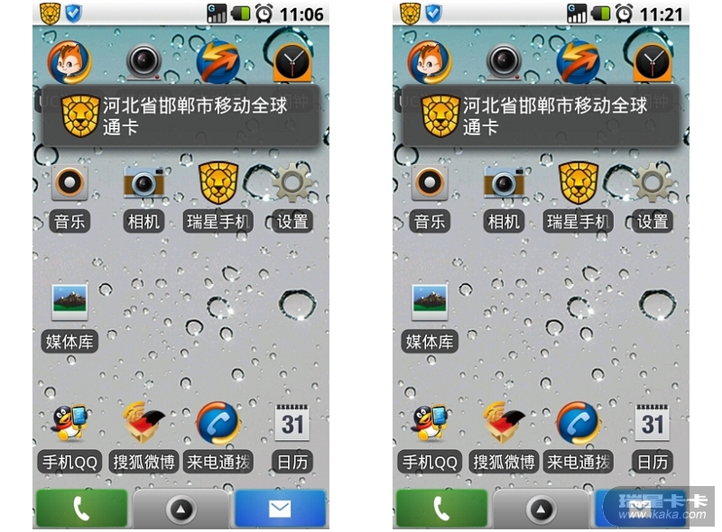 问题现象:拨打完电话后,归属地显示直接停留在屏幕上不消失了,打开哪个页面,它都会存在,无法清除,唯一的办法就是结束瑞星进程才能消失。截图为11:06的归属地在11:21分还存在!最后只能结束瑞星的进程了!