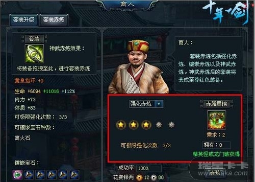 神武赤炼时,套装装备需极限强化+5,且2个特殊镶嵌孔全部镶嵌满;