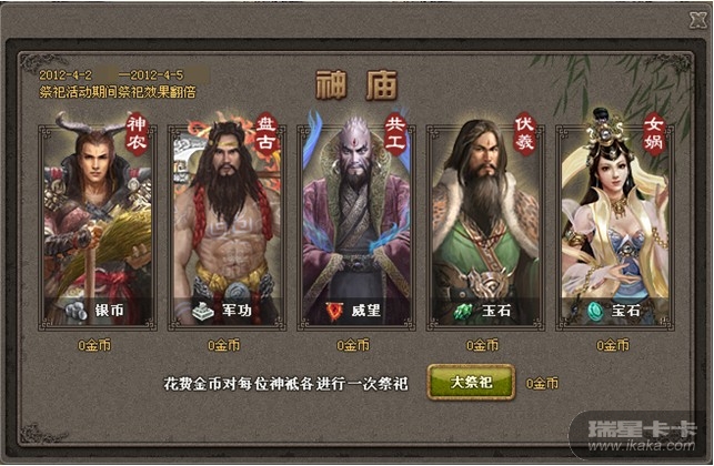 通过祭祀可以获得银币、军功、威望、玉石、宝石,活动期间效果翻倍!