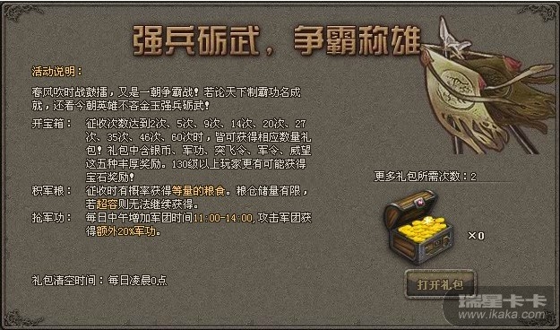 开宝箱:征收次数达到2次、5次、9次、14次、20次、27次、35次、46次、60次时,可得到相应数量的礼包!礼包中可能开出银币、军功、突飞令、军令、威望五种丰厚奖励!