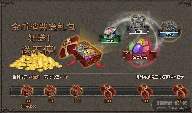 1) 每消费金币达到一定数目,就可以领取大量礼包