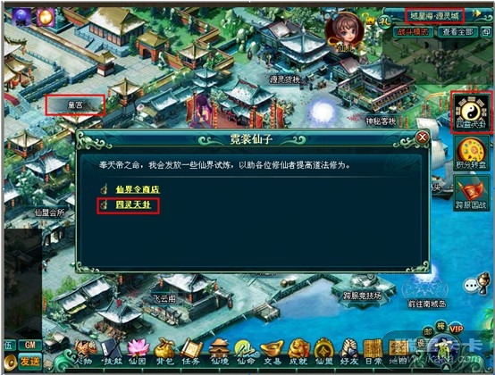 一、寻卦觅踪1、玩家可以在源灵城——皇宫——霓裳仙子——四灵天卦处进入卜卦界面;