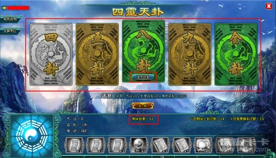 8、玩家每天每轮次卜卦,第一次系统发放得5张卦组成的卦象(玩家没有换卦),等级与卦象两者同时满足的条件下,即可获得额外奖励;