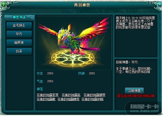 点,阵营君主或者女王可以召唤任意一只上古神兽,同阵营玩家可以群殴神兽,消灭神兽后,参与击杀神兽的玩家均可翻牌抽奖,奖品包括完美防具、中高级锻造石等珍贵装备道具;