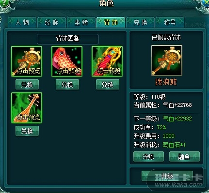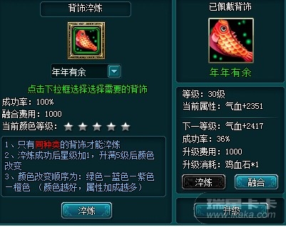 )背饰可以融合,玩家可以将高级的背饰融合到低级的同颜色背饰,即:玩家原有一个