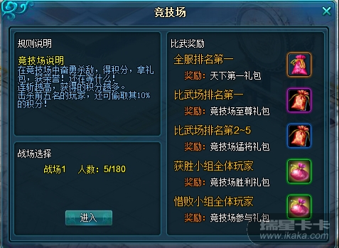 进入规则:竞技场开始后,系统自动创建第一个房间,房间人数上限为180名,超过人数上限,系统将自动开启第二个房间,一名玩家只能进入一个房间,中途离开,只可再进入之前的房间。竞技场中采用蒙面人设置,玩家在竞技场中看到其他玩家的名字都为蒙面人