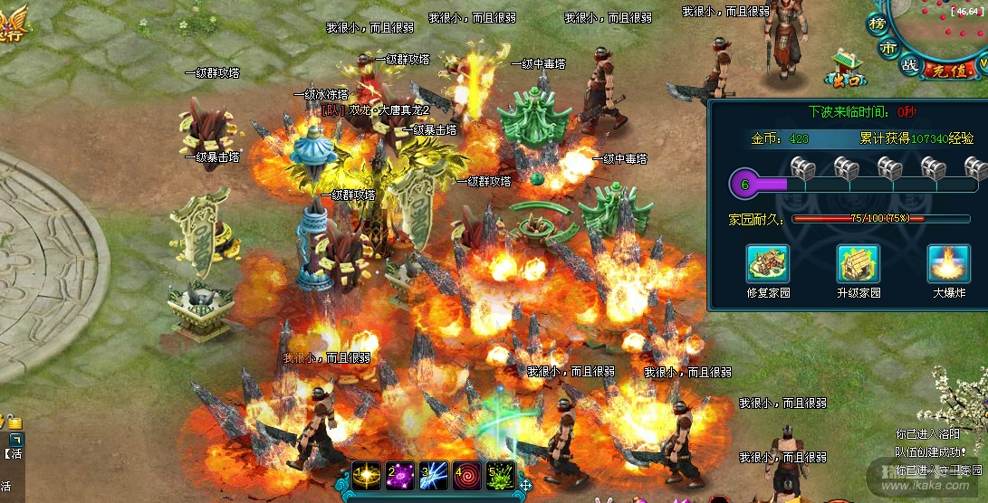 3、家园处于地图左侧,家园耐久度为100,每次被小怪成功攻破将损失耐久度,使用【修复家园】技能可修复一定的耐久度,当耐久为0时,该次家园守卫将失败。