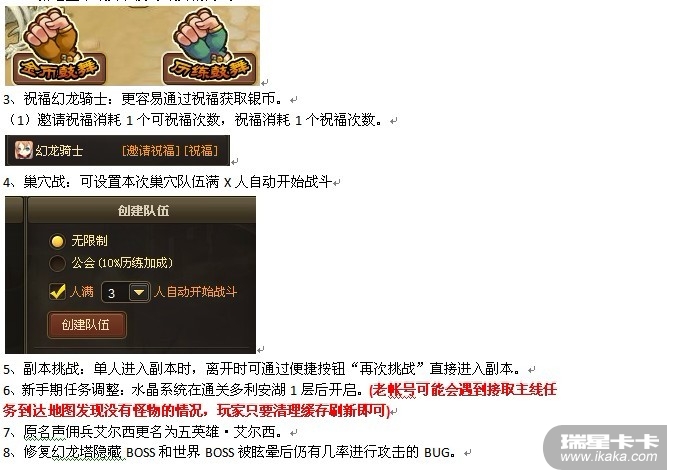 【新增内容】, 1、新开放3个名声佣兵:五英雄·黑骑士/五英雄·圣剑士/五英雄·武神士。(1)五英雄·黑骑士:250W名声(2)五英雄·圣剑士:400W名声(3)五英雄·武神士:650W名声【功能调整】1、幻龙塔:(1)每5层弹出抽奖面板,奖励包括白金培养石、至尊培养石、鉴定卷轴。(2)白金培养石、至尊培养石、鉴定卷轴各用于免费白金培养、至尊培养、鉴定一次。(3)降低幻龙塔怪物难度。2、世界Boss:(1)重生:立即复活并且开始战斗,当次战斗力得到一定的提升。(2)新增金币鼓舞和历练鼓舞的方式。