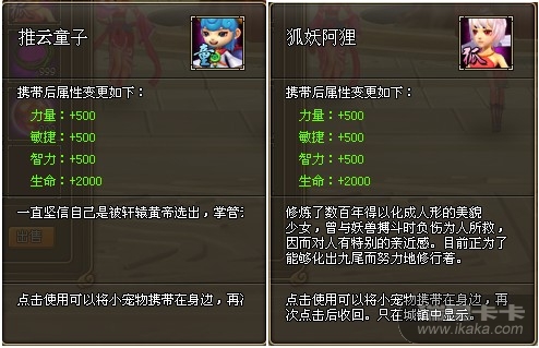 宠物以道具形式放在背包中,玩家可使用道具召唤非战斗宠物。召唤后,会看到宠物在城镇中跟随玩家,并且提升一定基础属性。宠物只能通过兑换得到,暂无其他的获得途径。