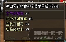 40个奖励星后可领取:士气天赋石x1、金色武魂宝箱x4、宝物升星符x4、极品经验卡x9。