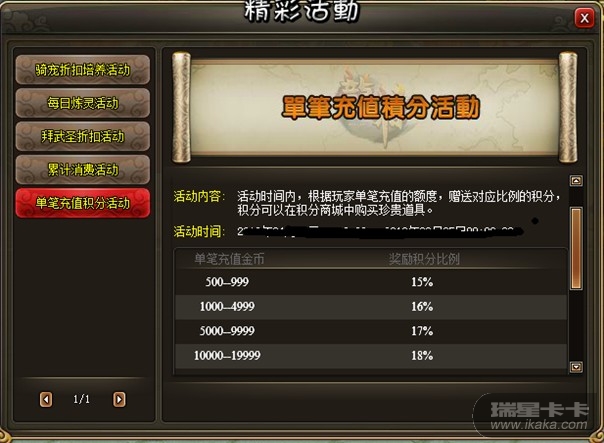 充值得到相应的积分比例,可以在“精彩活动”界面直接查看: