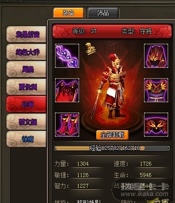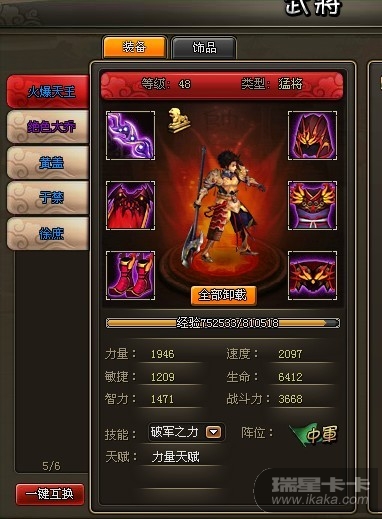 50级装备(6件)截图(包含主将名,套装属性截图)如下