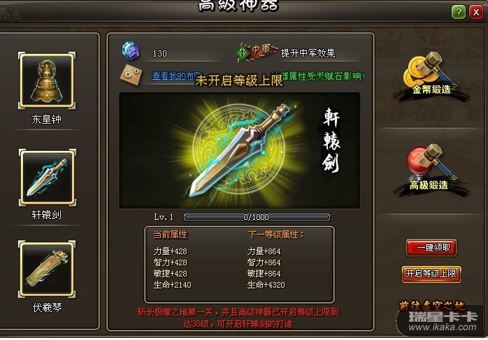 斩杀极暗之地第一关,并且高级神器已经开启上线达到30级,可开启轩辕剑的打造