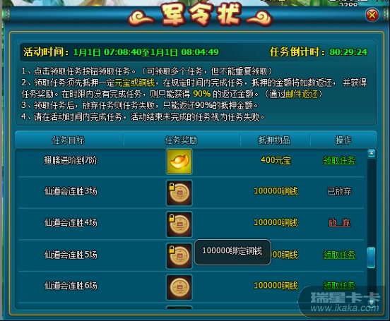 、领取任务须先抵押一定元宝或铜钱,在规定时间内完成任务,抵押的元宝和铜钱将如数返还,并给予任务奖励。3