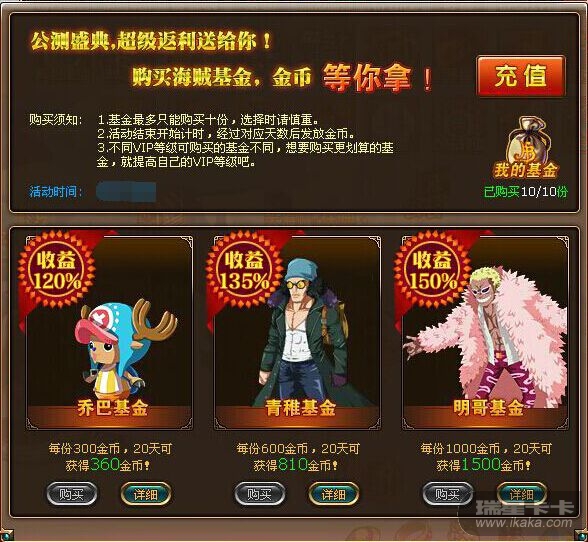 1. 乔巴基金:VIP1可XXX,花费300金币,活动结束时可立即领取120金币,之后每5可领取60金币(可领4次),总计领取360金币;