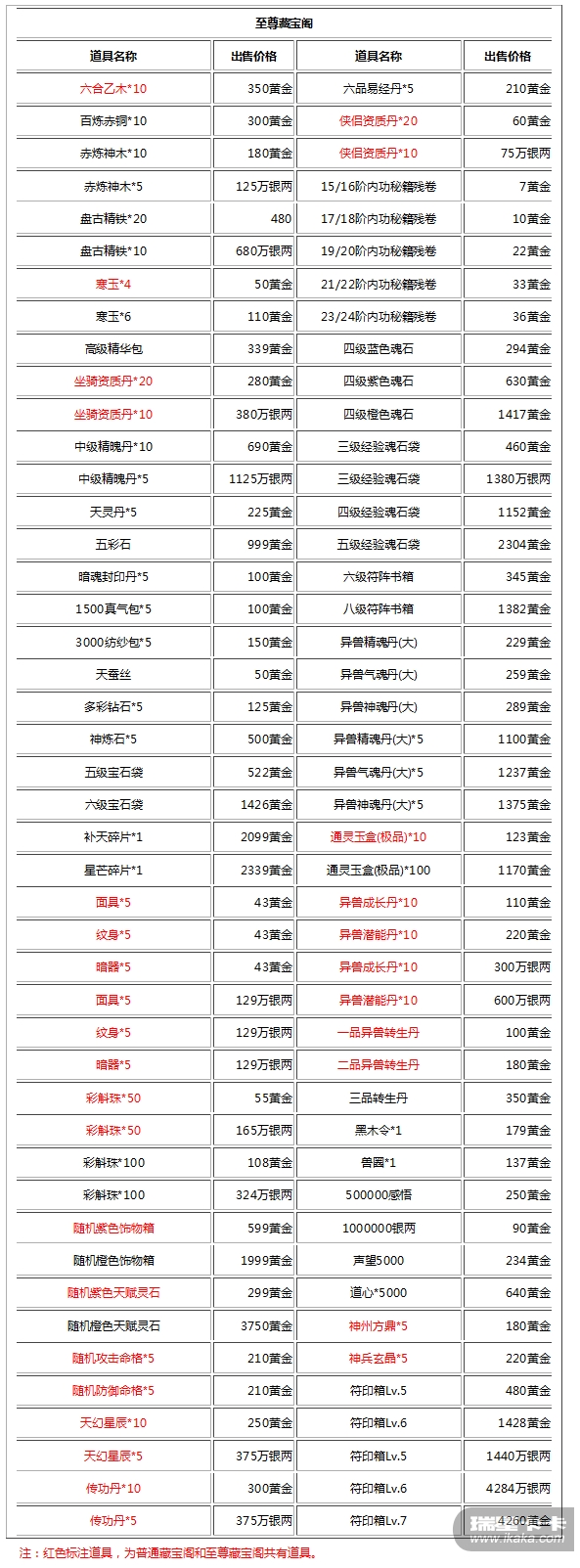 1. 以上道具均只可使用黄金购买。