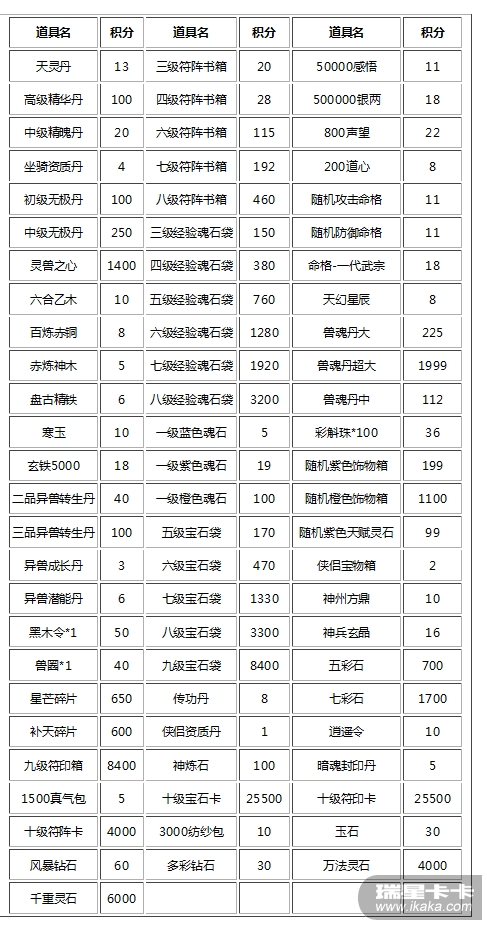 极品道具卡:可兑换指定道具中的一个(孟尝令-化缘僧、孟尝令-诸葛连英、孟尝令-凌竹息、通灵玉牌-玄帝、通灵玉牌-炎黄、通灵玉牌-羲凰、特级无极丹、红色神兵)
