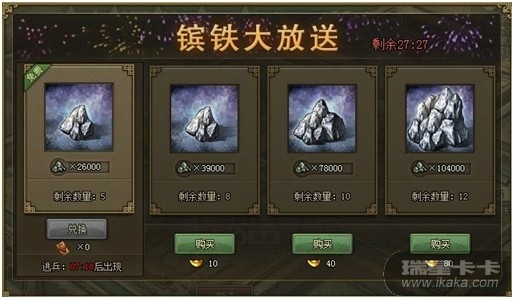 | 10000金币 | 6 | 赠送3件3星紫色装备、镔铁令*10 |