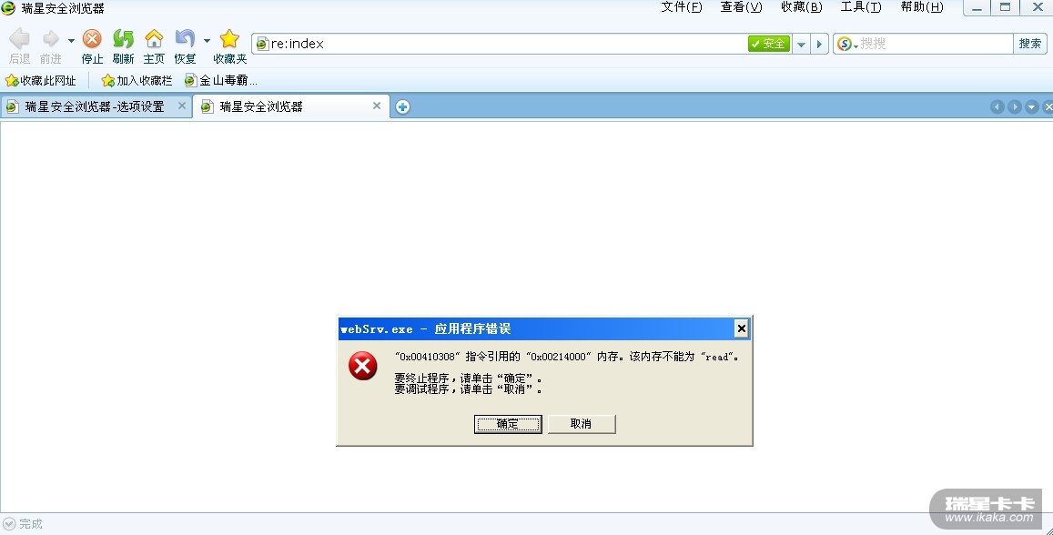 出现应用程序错误问题,建议修复瑞星安全浏览器,至于楼主所说的空白页问题,这个是瑞星为方便用户提供的标签页,在用户没有输入任何网址的情况下会出现,标签为用户经常使用的页面
