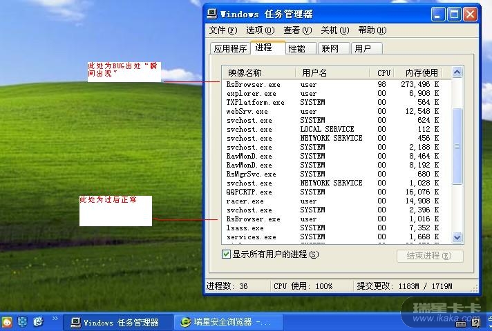 桌面点击打开‘瑞星安全浏览器’的瞬间,‘Windows任务管理器’进程页面显示CPU使用%90以上,内存使用瞬间曾加400MB左右,2到3秒后恢复正常!