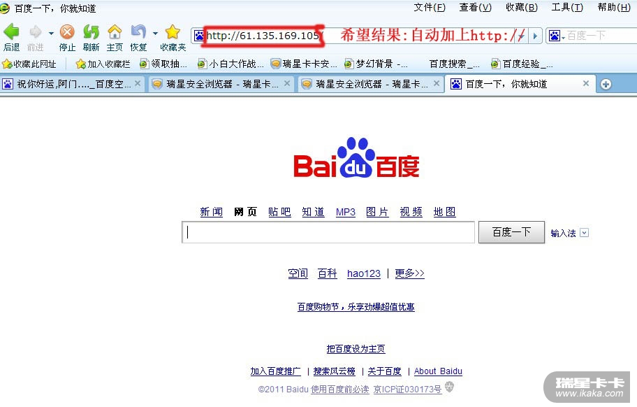 实际结果:通过输入IP(数字)访问网站的时候,瑞星浏览器的地址栏并不会补全http://,而当在地址栏中输入字母的时候,地址栏会自动补全:http://