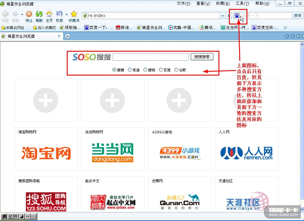2)在默认的页面中, 图标处点击后只有百度,但页面下方显示多种搜索方法,所以上面应添加和页面下方一致的搜索方法及对应的图标。