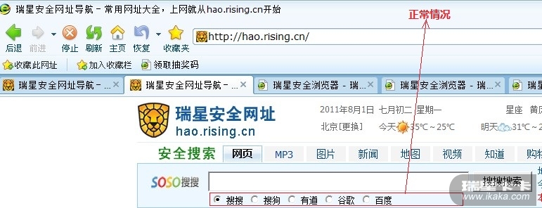 2.新建标签,选择瑞星安全网址导航网页。正常,能选择其他搜索方式。再次新建标签,选择瑞星安全网址导航网页,又出现只能选择百度搜索的问题。
