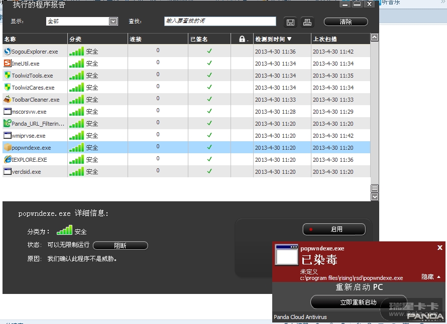Panda Cloud Antivirus 是因为我发现安装瑞星热点产品后,系统会比较卡机(计算机配置比较低),所以卸载了瑞星V16杀毒和防火墙,还有瑞星安全助手。结果发现,通过熊猫云杀毒进程管理功能,还看到了瑞星相关进程。(瑞星卸载均是正常系统卸载步骤)。我通过熊猫的进程管理功能阻止进程,结果失败了。熊猫云杀毒就会认为这是一个染毒进程。