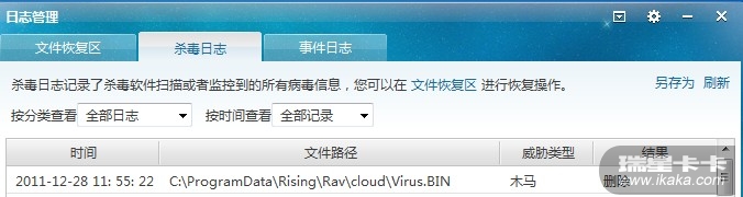 今天打开瑞星日志查看了一下,发现瑞星把自己的文件查杀了(如图)