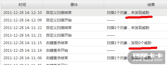 如图,自定义查杀和右键查杀的结果描述,一个是“未发现威胁”,一个是“发现0个威胁”