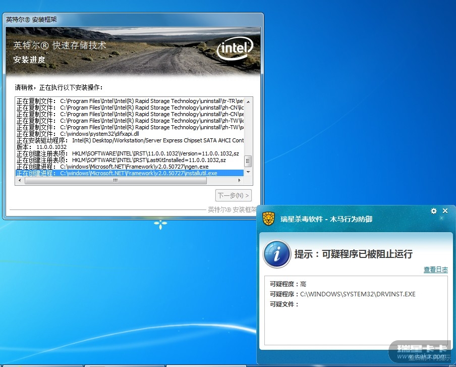 安装intel的Rapid Storage Technology驱动时,有文件被瑞星木马防御阻止